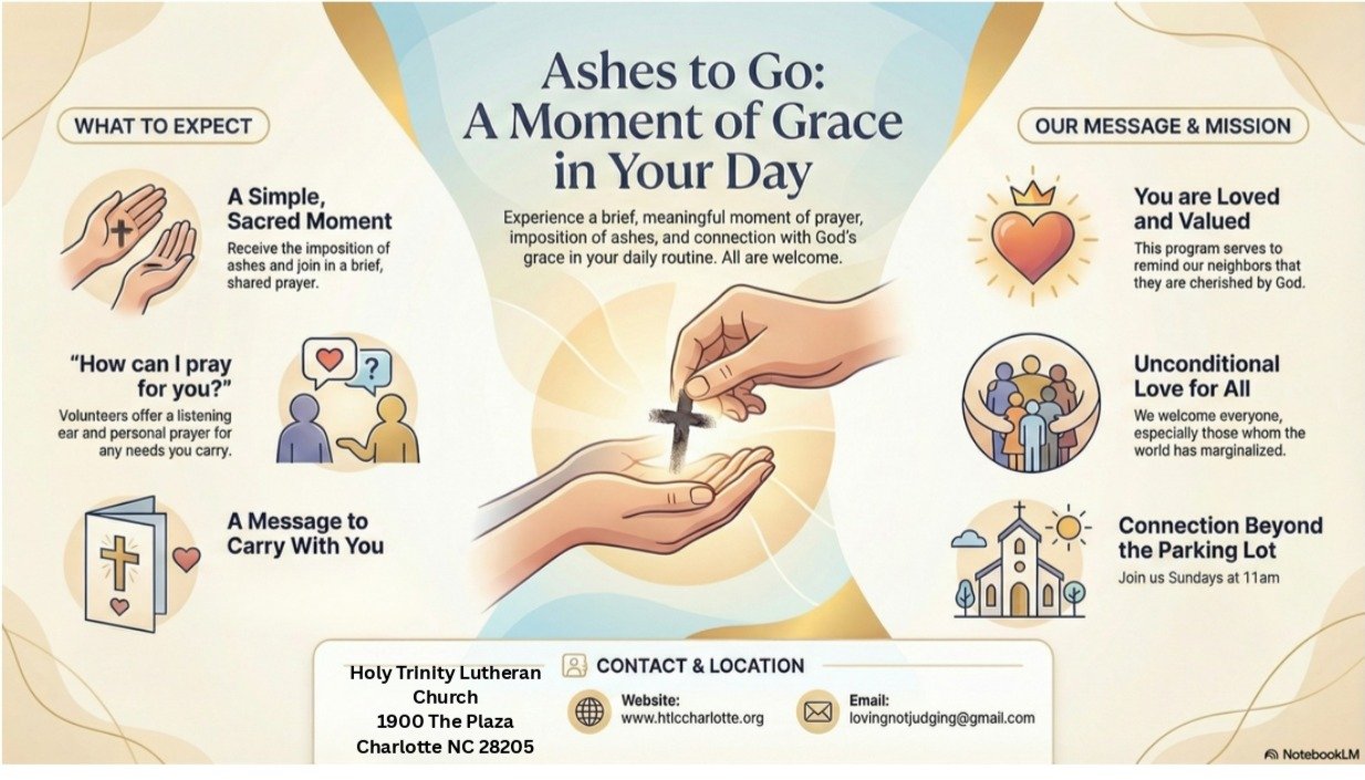 This Ash Wednesday, February 18, Holy Trinity Lutheran Church invites you to take a brief, meaningful pause with “Ashes to Go.” You can drive by or walk through our parking lot at 1900 The Plaza between 6:30–9:00 a.m. or 4:00–6:00 p.m. No service, no speeches—just a moment of reflection, kindness, and care. You don’t need to belong to a church or believe a certain way. Just come as you are. Interim Pastor Carolyn Hayford says, “We want to meet people in their everyday lives and offer a simple sign of grace. At Holy Trinity, we try to live ‘Loving Not Judging.’ Ashes to Go is a way of saying: you are human, you matter, and you are not alone.” This is Holy Trinity’s first year offering Ashes to Go, and we’d love to share this quiet moment with you—right in the middle of an ordinary day.